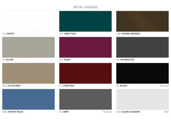 White, Deep Teal, Anodic Bronze, Silver, Plum, Anthracite, Olive Grey, Chestnut, Black, Distant Blue, Grey and Clear Lacquer.